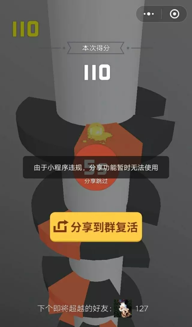 玩家本轮“死”后,计分页面会有10S的倒计时,玩家只要在该时间内将小游戏分享至微信群,立即复活;